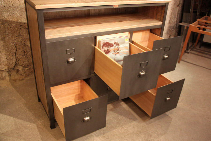 Modèle présenté : frêne massif , structure en acier soudé , finition vernis vieillit aspect design industriel , 6 tiroirs + niches pour ampli , platine...